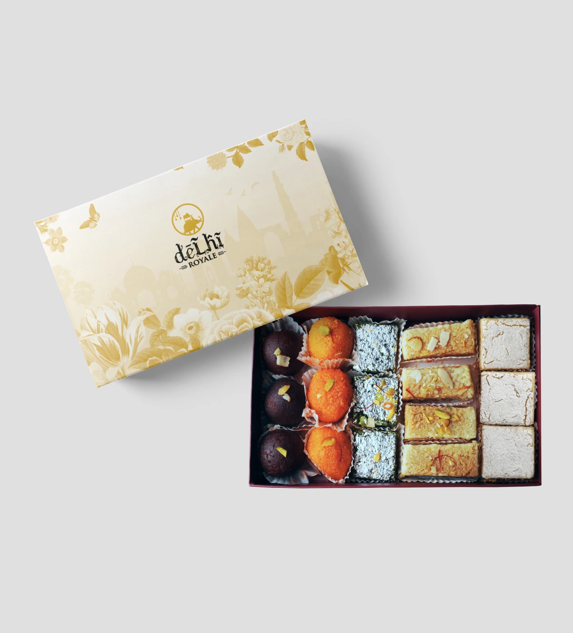 This box holds an assortment of 16 pieces of indulgent sweets: